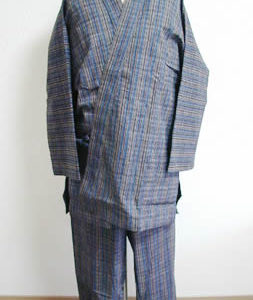 作務衣の縫製、製造、製作実例 織物のメーカー様からのご依頼で製作した作務衣です。縞柄の先染め生地(糸の段階で色…